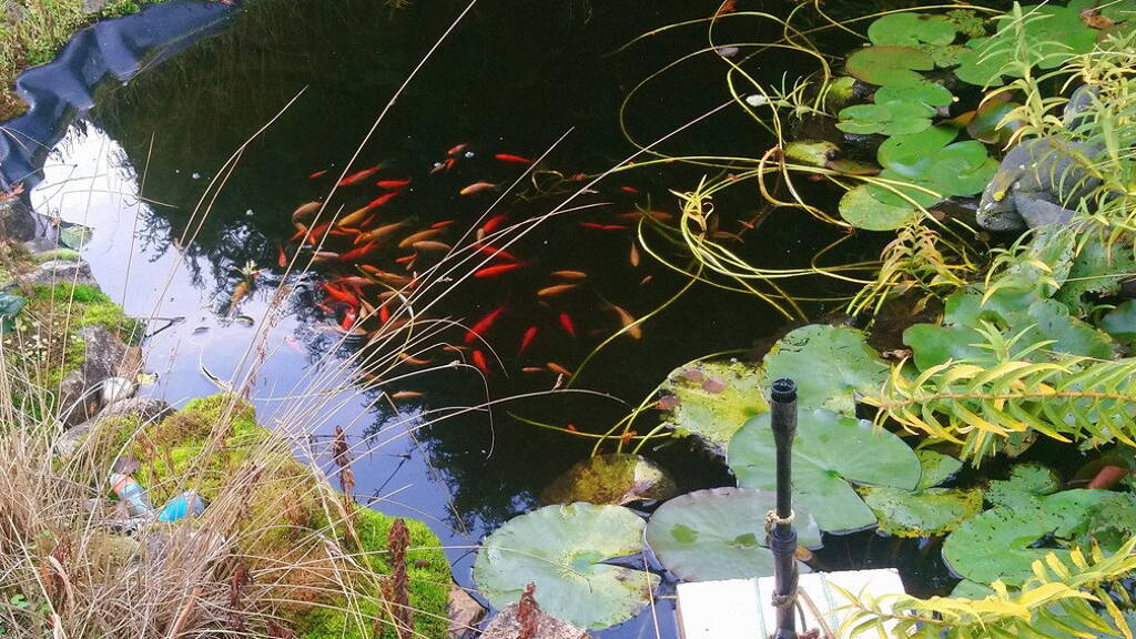 Grundstück ca. 250 qm: Kleiner Garten mit Obst Bäumen und Gartenteich.