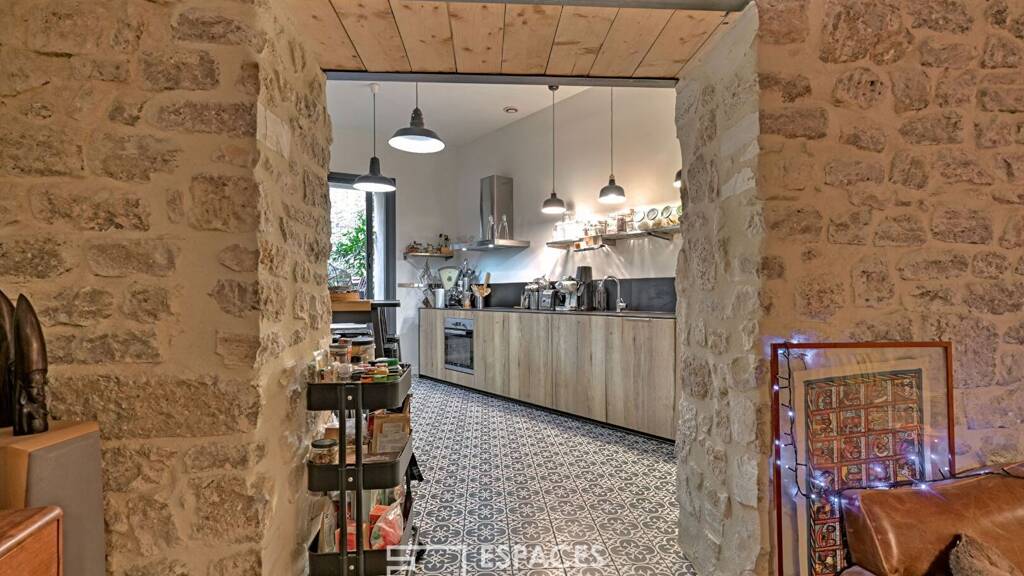 The house already feels alive, multifaceted, and deeply inhabited. As you ascend, the view expands. The first floor houses the reception areas: the living room and dining room flow seamlessly into the kitchen in a warm and inviting atmosphere. On this floor, there is also a light-filled, independent workshop, ideal for creating or working from home, which could easily be converted into a studio. Openings extend the rooms outwards, and the intimate 40 m2 terrace becomes a breath of fresh air, a natural link between stone and sky.