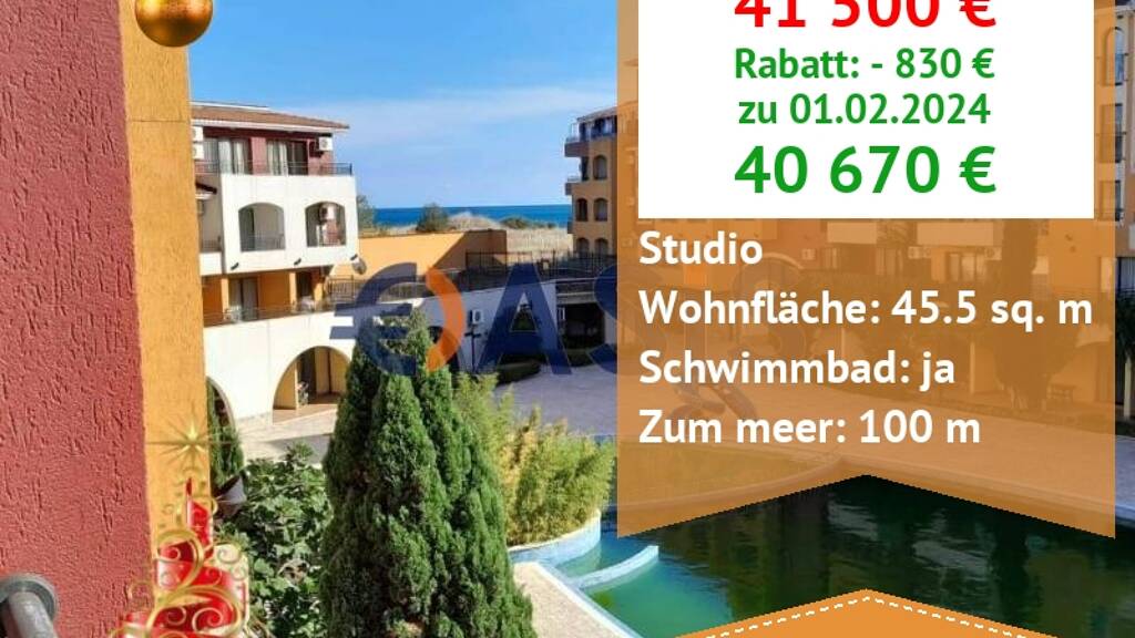 Der 4-Sterne-Komplex Marina Cape befindet sich im Dorf Acheloy, am Meer, in einer ruhigen und friedlichen Lage, abseits des touristischen Lärms. Der Komplex von einzigartigem Ausmaß ist für den Urlaub mit der ganzen Familie gedacht, liegt in der ersten Meereslinie und verfügt über eine ausgezeichnete Infrastruktur. Der Komplex ist eine Sammlung von Gebäuden und besteht aus 4 separaten Zonen, die in einem Gebiet vereint sind. Die Architektur der Gebäude ist im klassischen Stil mit einer angenehmen Farbgestaltung ausgeführt. Auf einem gepflegten, riesigen Gelände von 40.000 Quadratmetern. es gibt 2 Pools mit einem Kinderbereich mit Wasserrutschen, Entspannungs- und Sonnenliegen,4 Restaurants, einen Supermarkt, 24-Stunden-Rezeption, einen Kinderspielplatz, ein Spielzimmer, ein Fitnesscenter, eine Sauna, Massagen, einen Billard- und Tischtennisraum, einen Konferenzraum, einen Bowling-Raum, Parkplätze, 24 Stunden Sicherheit, Unterstützung des Komplexes durch die Verwaltungsgesellschaft, Mietservice für die Wohnung. Marina Cape befindet sich in einer ruhigen und friedlichen Gegend, abseits des Touristenlärms. Das Zentrum von Acheloy mit Restaurants, Cafés, einem Kindergarten, einer Schule und allem, was Sie zum Entspannen brauchen, erreichen Sie nach 1000 m. Zum eigenen Strand und zum Jachthafen sind es nur 100 m. Der Strandstreifen von Acheloy ist etwa 1 km lang und 20 Meter breit. Für Wassersportbegeisterte werden Surfen, Windsurfen und Motorjets angeboten. In der Nähe des Komplexes befindet sich ein umweltfreundlicher Fluss, der ein beliebter Ort für Fischer ist. Pomorie ist einer der besten Orte für den balneologischen Tourismus, dank des Heilschlamms, in einer Entfernung von 12 km.