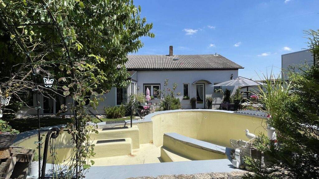 Der uneinsehbare Garten bildet einen privaten Rückzugsort mit großzügigem Swimmingpool, altem Baumbestand und viel Platz zum Entspannen, Arbeiten oder Zusammensein. Eine separate Garage sowie ein eigener Brunnen zur Gartenbewässerung runden das Angebot ab.