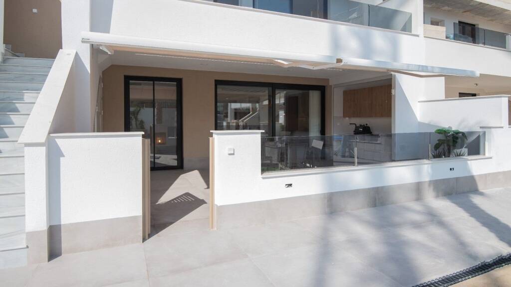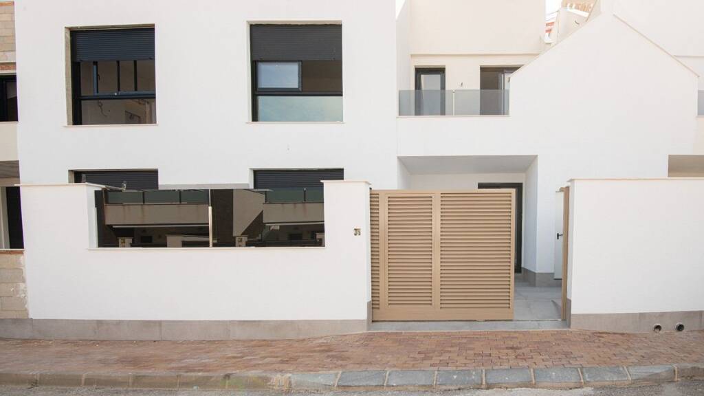Der Komplex besteht aus Erdgeschoss-Wohnungen mit einem privaten Garten und Dachgeschoss-Wohnungen mit einer privaten Dachterrasse Solarium. Die Innenräume verfügen über einen geräumigen, offenen Wohn- und Essbereich mit moderner Küche, ein Hauptschlafzimmer mit eigenem Bad, zwei weitere Doppelschlafzimmer und ein Gästebad. Die Wohnungen im Erdgeschoss verfügen über große Terrassen und Gartenbereiche auf der Vorder- und Rückseite des Anwesens sowie über einen privaten Parkplatz auf dem Grundstück mit automatischem Zugangstor. Die Wohnungen im obersten Stockwerk haben eine vordere Terrasse mit einer Außentreppe, die Zugang zur großen Dachterrasse von 77 m2 mit Sommerküche, Pergola, elektrischem Grill, Toilette, Abstellraum, Außendusche und Vorinstallation für einen Whirlpool bietet, und es gibt einen privaten Parkplatz.