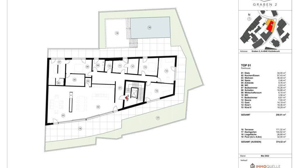 Weit oben, den Blicken der Passanten am Kreuzpunkt von Graben 2 und der Jungmairgasse entschwebt, wartet ein wahrlich royales Penthouse mit einem Rundum - Panorama über den Dächern von Vöcklabruck auf seine Fertigstellung bis Ende 2023 - und auf einen einzigen, wertschätzenden Eigentümer, der es sein Eigen nennen möchte.
