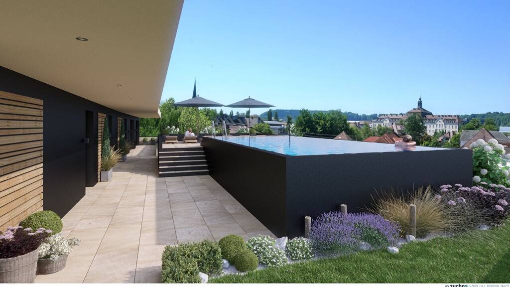Das Prunkstück der Außenflächen ist ein gigantischer Pool (32 m²), begleitet von einer eigens dafür errichteten Liegefläche von 27 m². Dies ist das Wellness-Gegenstück zur eigenen Sauna im Penthouse und ermöglicht dem Bewohner rund um das ganze Jahr, Körper und Geist im Gleichgewicht zu halten.