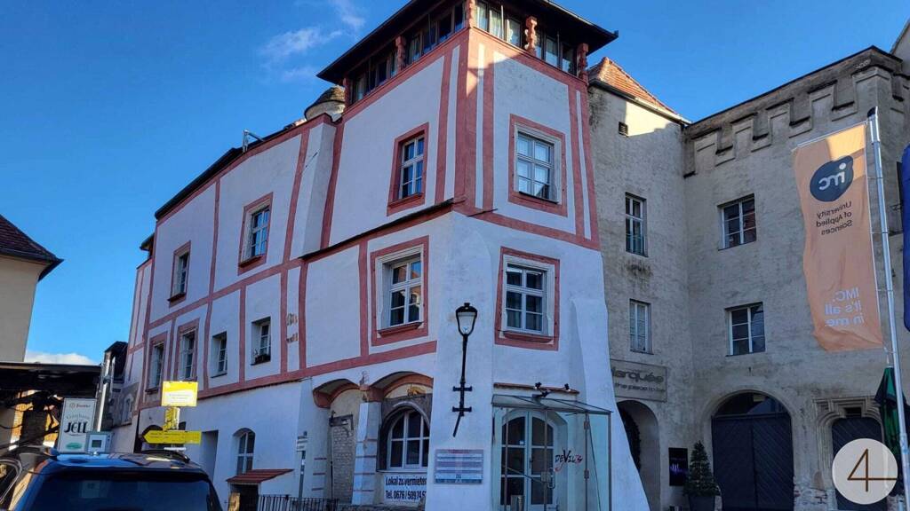 * TOP 1: Bar mit Schanigarten und Teilkeller - perfekt für Gastronomie. * TOP 2: Büro im ersten Stock - ideal für kreative Köpfe. * TOP 3: Gotische Tafelstube - für exklusive Veranstaltungen oder als Rückzugsort. * TOP 4: Wohnmöglichkeiten im zweiten Stock - 2-Zimmer-Wohnung und DG-Wohnung mit Terrasse, direkt vom Lift erreichbar.