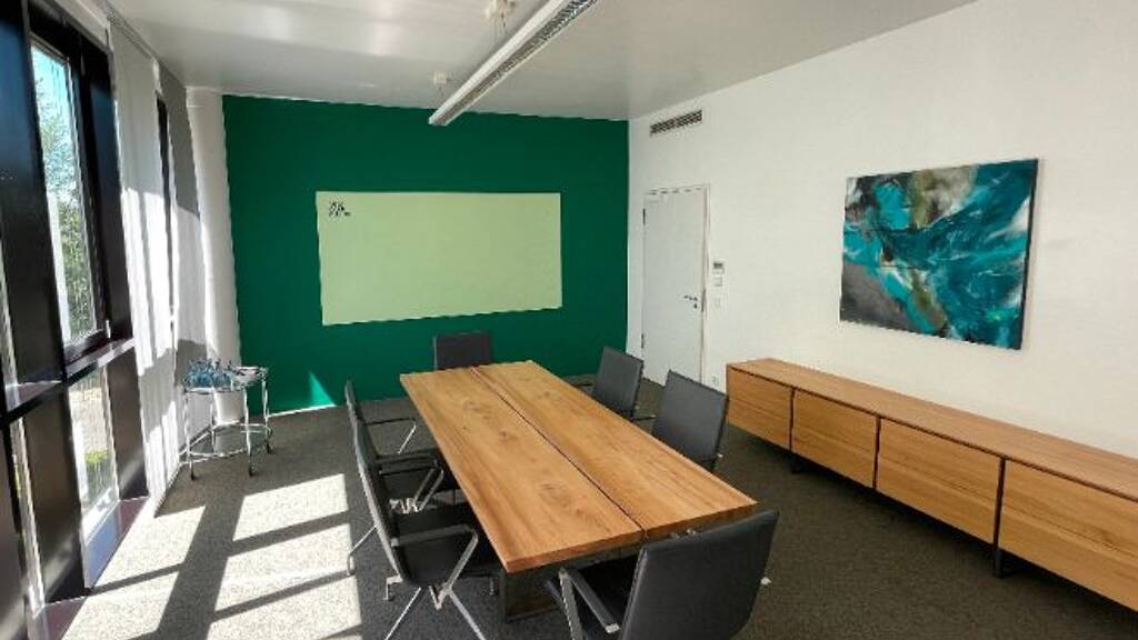 Das Büro befindet sich am Ulmer Standort der New Work Station direkt an der Blau gelegen. Dank der großen Fenster ist der Raum besonders hell und wirkt sehr einladend.