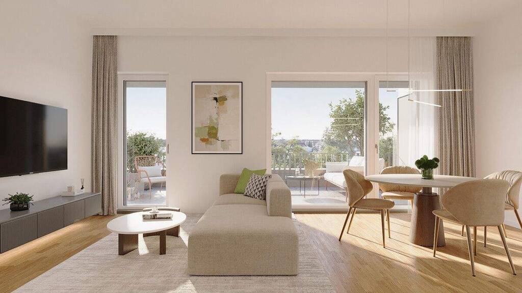 Ausstattung: . gemütlicher SüdBalkon . Offener Wohn-, Koch- und Essbereich . Verglast Loggia . Fernwärme, Fußbodenheizung . Energieeffizienzklasse A (Fernwärme) . Lift von der Tiefgarage bis ins Dachgeschoss . Mit Blick ins Grüne
