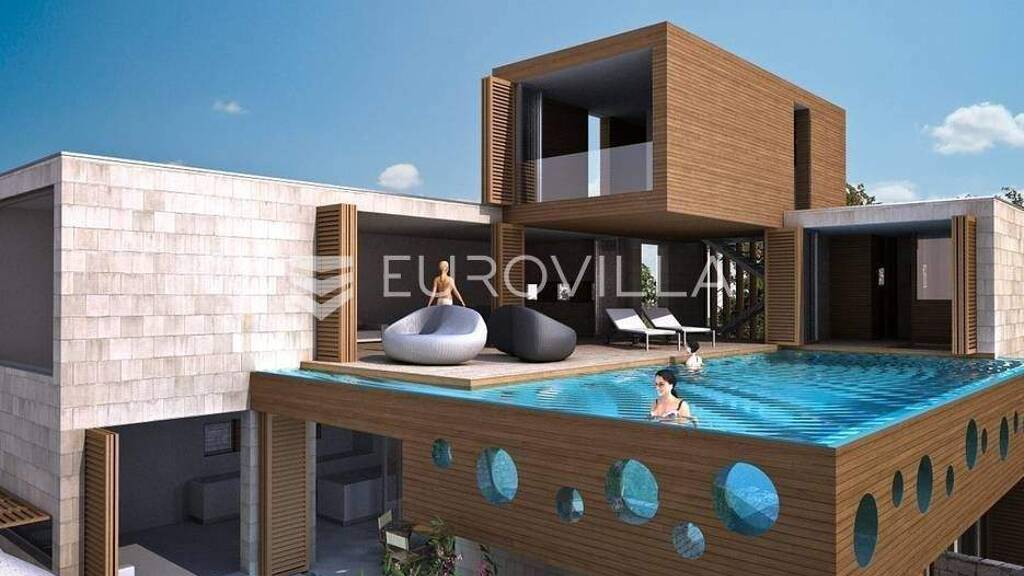 Vila interesantnog dizajna, smjestena na izuzetno atraktivnoj uvali na otoku Korculi. Ukupne bruto povrsine od 400 m2, ovaj koncept vile u potpunosti koristi vizualne prednosti lokacije, koja je svega 5 m od mora. Objekt je funkcionalno podijeljen u tri cjeline. Sjeverni dio vile sadrzi kuhinju s blagovaonicom, dnevni boravak, sanitarije sa garderobom te veliko spremiste. U juznom dijelu vile smjestene su 3 spavace sobe sa pripadajucim kupaonicama i garderobama. Na nivou prizemlja smjesten je dnevni boravak, blagovaonica s kuhinjom, natkrivena terasa, bazen sa otvorenom suncanom terasom, fitness i toalet. Na prvom katu je predvidena jedna spavaca soba s toaletom. Vila ce posjedovati saunu i jacuzzi. Vertikalna komunikacija rijesena je unutarnjim drvenim stubistem na zeljeznoj konstrukciji. Na parceli je predvideno 6 parkirnih mjesta, a okolis ce biti ureden autohtonim zelenilom.Vila je u zavrsnoj fazi gradnje, te ce biti uredena s postavljenim podovima, keramikom, vanjskom i unutarnjom stolarijom te ce ju Kupac po zelji moci urediti namjestajem po vlastitom ukusu.Zbog svoje pozicije vila ima panoramski pogled na sve strane svijeta.Ostale informacije na upit.