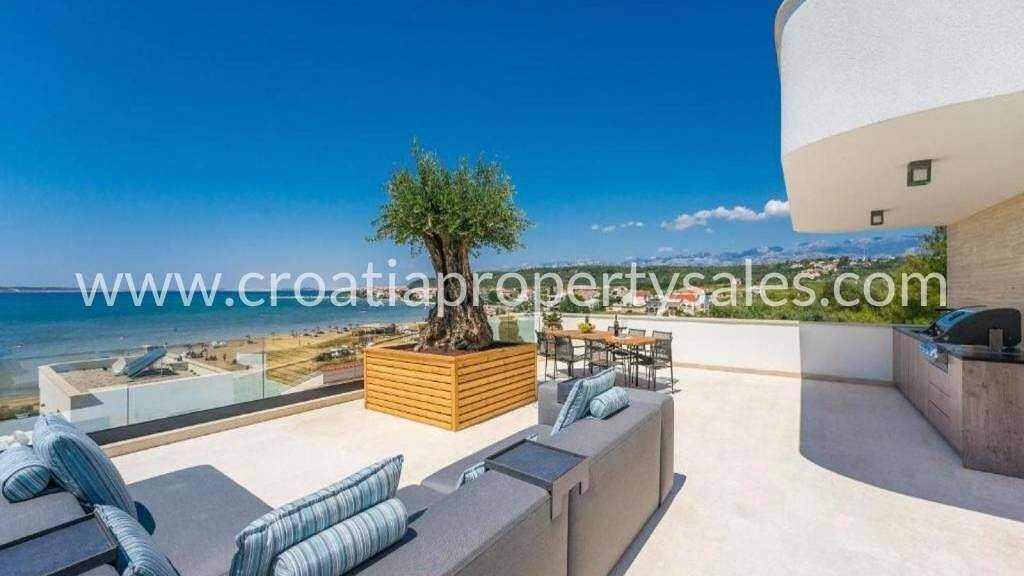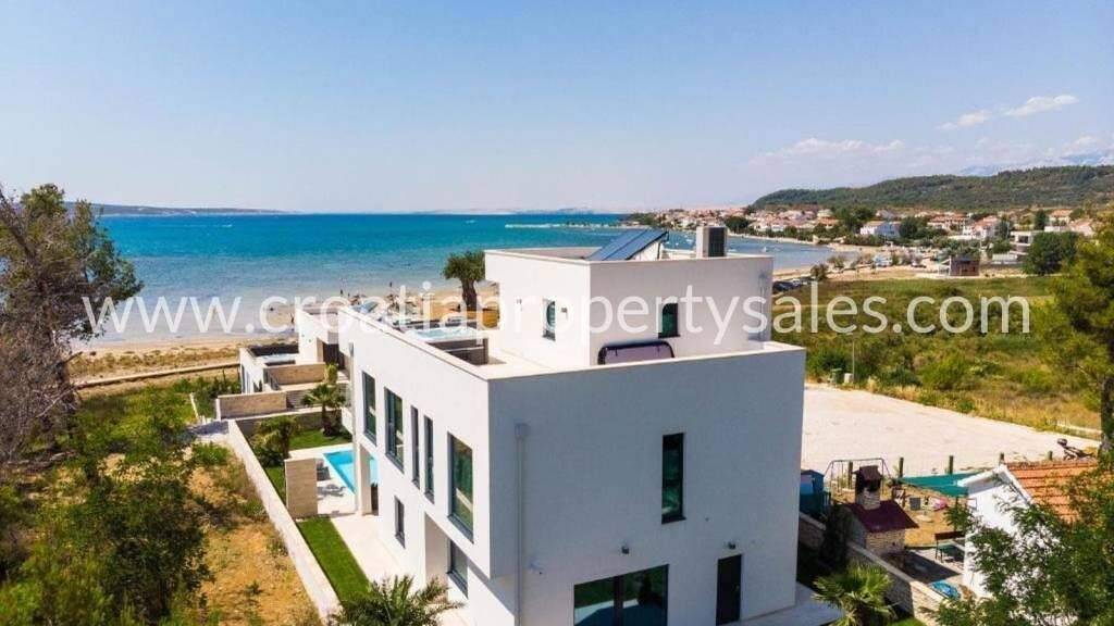 Luxuriöse Villa mit drei Schlafzimmern in ruhiger Lage, nur 50 m vom Strand entfernt. Eingebettet in Pinienwälder bietet das Anwesen von jedem Winkel aus einen atemberaubenden Panoramablick auf das Meer. Die Villa erstreckt sich über drei Etagen. Im Erdgeschoss befinden sich eine offene Küche, ein Wohn- und Essbereich mit Zugang zur Terrasse mit Lounge-/Sonnenbereich und einem 35 m2 großen, beheizten Swimmingpool. Im ersten Stock erwarten Sie drei geräumige Schlafzimmer mit jeweils eigenem Bad und begehbarem Kleiderschrank. Das Hauptschlafzimmer verfügt über einen privaten Balkon mit Meerblick. Die 110 m2 große Dachterrasse bietet einen Wellnessbereich mit Sauna, Whirlpool und Außenküche mit Essbereich und Blick auf das Velebit-Gebirge und das Meer. Zur Villa gehören außerdem ein Fitnessraum, luxuriös ausgestattete Badezimmer mit Naturstein, hochwertige Multimedia-Ausstattung und ein Videoüberwachungssystem. Natursteinböden und ein exklusives Designer-Interieur unterstreichen Eleganz und Komfort. Die Villa ist komplett ausgestattet und sofort bezugsfertig. Sie verfügt über luxuriöse Gartenmöbel, eine vollautomatische Bewässerungsanlage und zwei Außenduschen. In allen Badezimmern wurden hochwertige Natursteinböden, antike burgundische Pflastersteine aus Frankreich, verlegt. Die Duschen sind aus antikem Grimaud-Kalkstein aus Frankreich gefertigt. Die Sanitäreinrichtungen stammen von Villeroy & Boch, alle Armaturen von AXOR. Die hochwertigen, teils begehbaren Kleiderschränke in allen Räumen wurden von der Tischlerei PeSe aus Sylt, Deutschland, hergestellt. Das Anwesen liegt 20 km von Zadar und dem internationalen Flughafen entfernt.