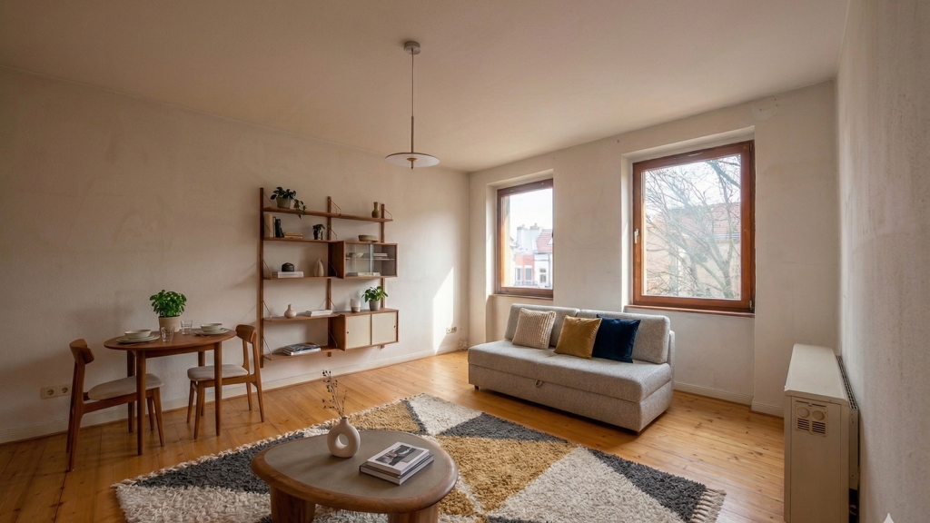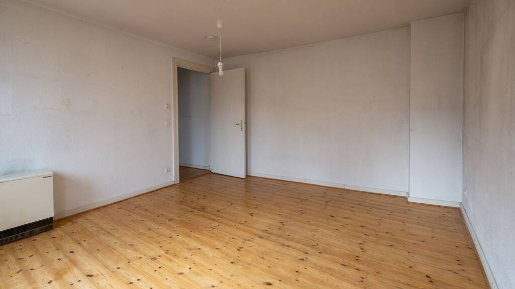 Flur und Wohnzimmer sind mit einem gut erhaltenen Dielenboden ausgestattet. Das Hauptzimmer verfügt über zwei großzügige Fensterfronten, die für eine gute Belichtung sorgen.