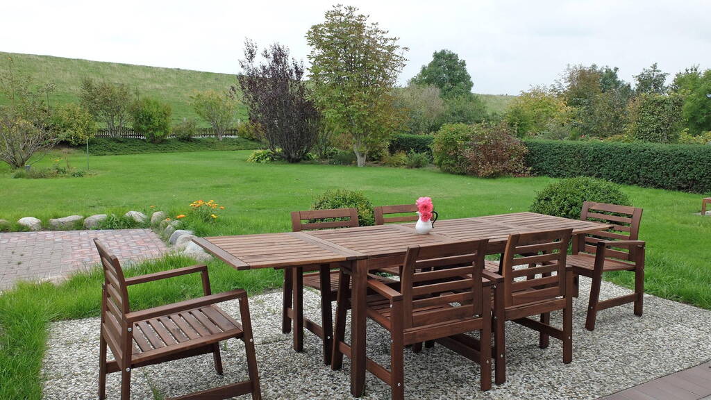 Mit gemütlichen Outdoor-Möbeln ausgestattet, bietet der Garten den idealen Ort zum Entspannen und Abschalten.