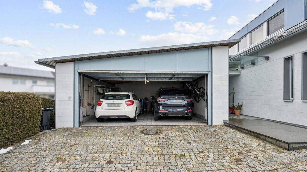 Eine geräumige Doppelgarage mit elektrischem Tor, 16A-Starkstromanschluss und Waschbecken ist vorhanden, eine Wallbox kann unkompliziert nachgerüstet werden. Das Grundstück umfasst ca. 679 m2.