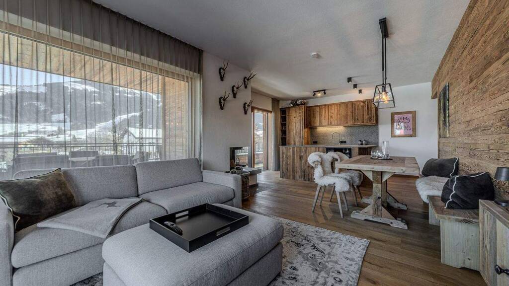 Die hochwertige Ausstattung wurde mit viel Liebe zum Detail und unter Verwendung erlesener Materialien umgesetzt. Ein stilvoller Kaminofen sorgt für behagliche Atmosphäre, während die maßgefertigte Altholzküche mit Geräten von Miele und Bora höchste Ansprüche an Design und Funktionalität erfüllt. Maßgefertigte Altholz-Einbauschränke und Wandelemente, edle Eichenholzdielen und -türen sowie dreifach verglaste Lärchenfenster unterstreichen den Chalet-Charakter des Appartements.