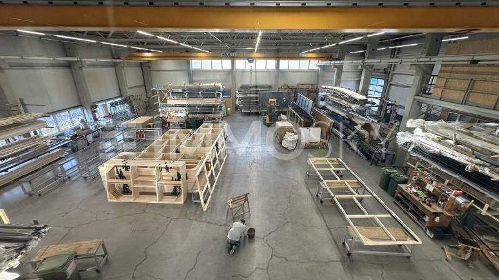 Die Haupthalle umfasst ca. 620qm und zwei 1,6t Deckenkräne. Die Raumhöhe bis unter die Kräne gemessen beträgt ca. 6m.