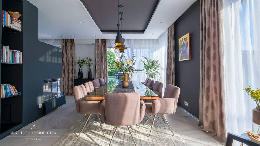 Beim Betreten, über den imposanten Eingangsbereich des Hauses, werden Sie sofort vom weitläufigen Wohn-Essbereich begeistert sein, der durch seine Offenheit und Helligkeit besticht. Die moderne, voll ausgestattete Küche lässt keine Wünsche offen und bietet hochwertige Materialien, die sowohl funktional als auch ästhetisch überzeugend sind. Weitere Highlight sind die großen Fensterflächen, der edle Kamin im Wohnbereich und die Klimaanlage. Die großformatigen Fliesen in besonderer Stein-Optik, die stilvollen Deckenspots und indirekte Beleuchtung runden das Ambiente perfekt ab.