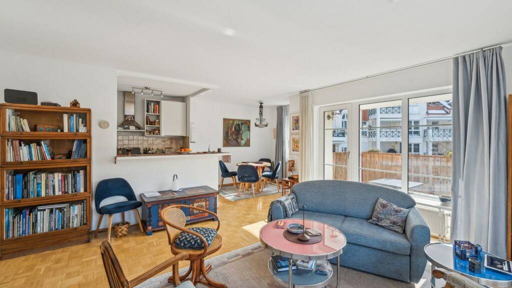 Der großzügig geschnittene Wohnbereich bildet das Herzstück der Wohnung und geht fließend in die offen gestaltete Einbauküche über. Dieses moderne Wohnkonzept schafft eine angenehme und kommunikative Atmosphäre und bietet gleichzeitig ausreichend Platz für individuelle Einrichtungsmöglichkeiten. Der hochwertige Parkettboden verleiht den Räumen ein warmes und gepflegtes Wohngefühl.
