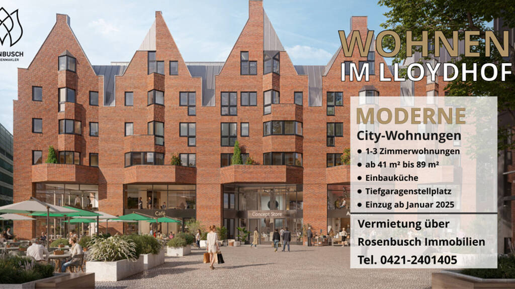 Diese moderne 2-Zimmer-Wohnung im 1. sowie 2. Obergeschoss des neu gestalteten Lloydhofs überzeugt durch ihre großzügige Raumaufteilung und hochwertige Ausstattung. Das Herzstück der Wohnung ist der ca. 41 m² große Wohn- und Essbereich, der durch seine Offenheit und die integrierte, neue Einbauküche begeistert. Hier finden Sie ausreichend Platz für Ihre Einrichtungsideen und genießen ein helles, freundliches Wohnambiente dank der großen Fensterfronten.