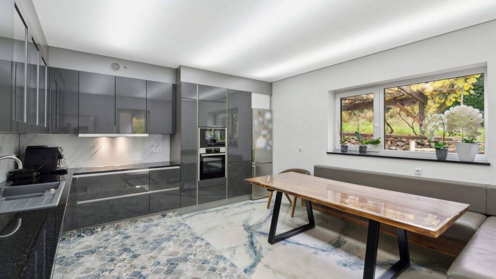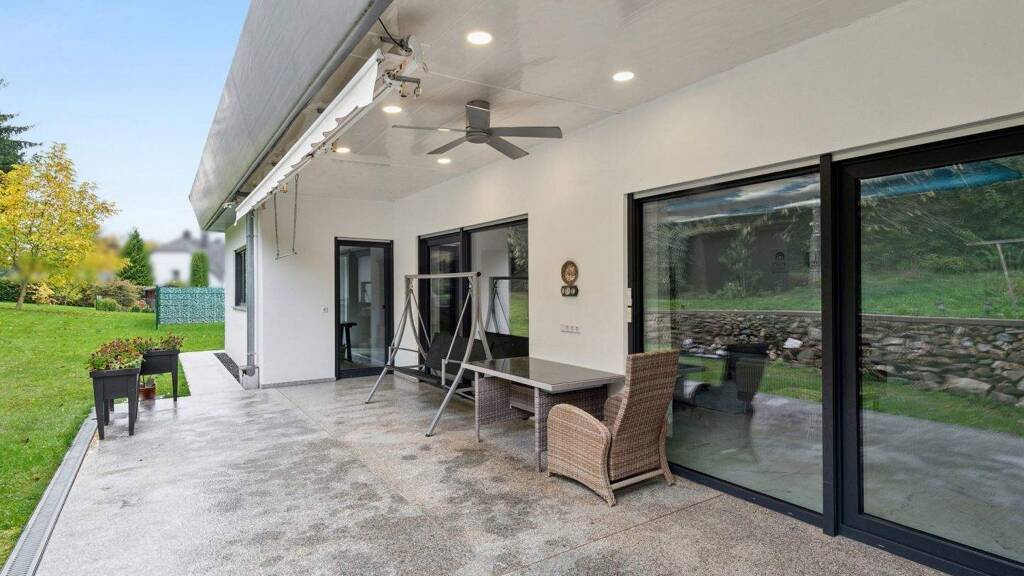 Auch technisch überzeugt die Immobilie auf ganzer Linie. Großflächige Spanndecken verleihen den Räumen eine moderne Eleganz, während der hochwertige Epoxidharzboden, größtenteils ca. aus 2023, pflegeleicht und langlebig ist. In jedem Raum sorgen bodentiefe Fenster mit Sicherheitsglas für Licht, Sicherheit und ein offenes Wohngefühl. Beheizt wird das Haus über eine Fußbodenheizung, die von einer umweltfreundlichen Pelletheizung im Nachbarhaus gespeist wird - selbstverständlich rechtlich geregelt und im Grundbuch eingetragen. Zusätzlich sorgt ein wasserführender Kamin im Wohnbereich für wohlige Wärme und gemütliche Stunden im Winter.