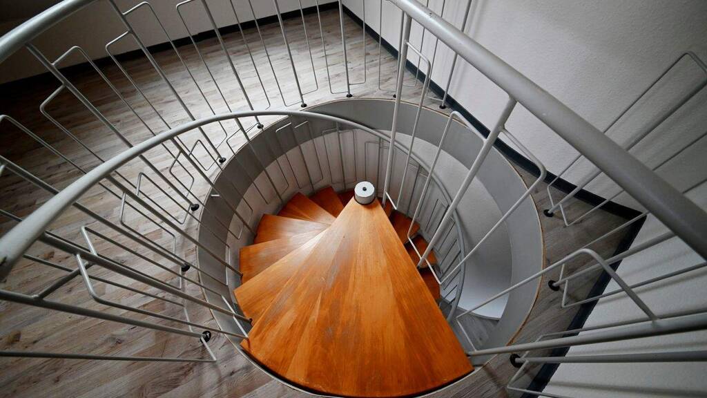 Über eien Wendeltreppe geht es zur zweiten Ebene. Hier befindet sich eine Galerie, von der ein Arbeitszimmer abgetrennt wurde.