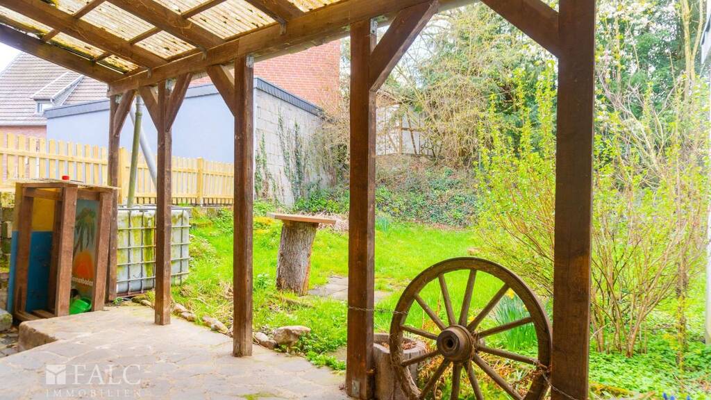 Der angrenzende Garten lädt zum Entspannen, Spielen oder Gärtnern ein und rundet das Gesamtbild harmonisch ab.