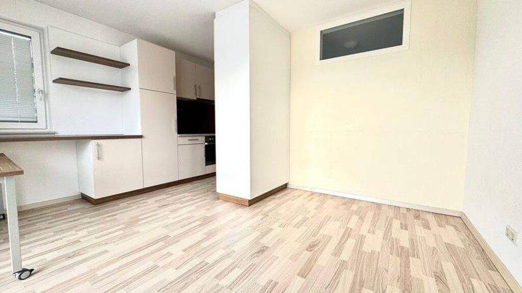 Das Apartment ist hochwertig mit maßgefertigten Schreinereinbauten möbliert und überzeugt durch eine durchdachte, platzsparende Raumgestaltung mit großzügigem Stauraum. Ein deckenhoher Kleiderschrank mit integrierter Garderobe trennt den Eingangsbereich von einer ruhig gelegenen Schlafnische mit Bett (90 × 200 cm).