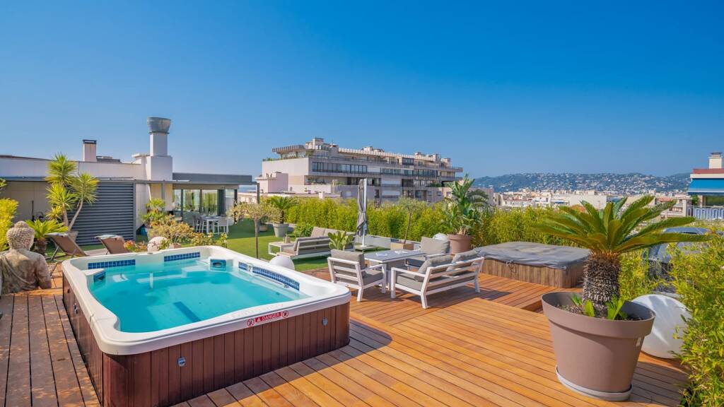 This splendid terrace is a veritable roof garden, with its swimming pool, Jacuzzi and BBQ area.