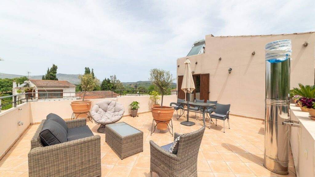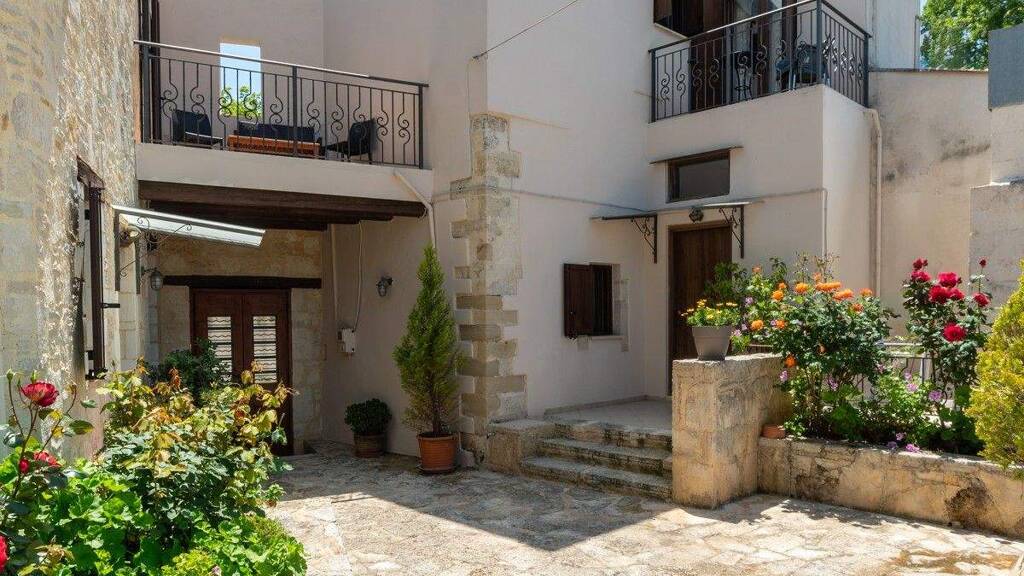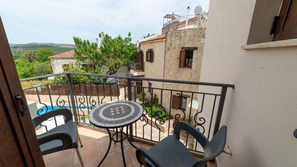 Drei schöne Balkone bieten charmante Plätze für den Morgenkaffee oder zum Genießen der Dorfatmosphäre, während die große Dachterrasse einen Panoramablick über die Dächer von Armenoi bietet – perfekt für Abendessen bei Sonnenuntergang oder entspannte Stunden. Der gemeinschaftliche Innenhof trägt zum authentischen kretischen Lebensgefühl bei.