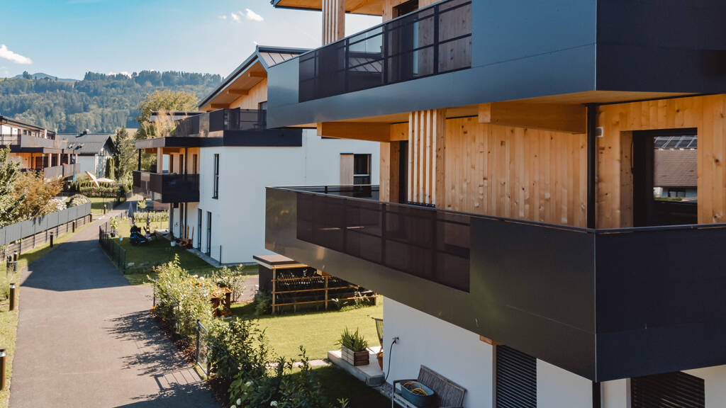 Die attraktiven Wohnungen der fünf mehrgeschossigen Vollholz-Baukörper besitzen großzügige Privatgärten oder Balkone/Terrassen bzw. Dachterrassen.
