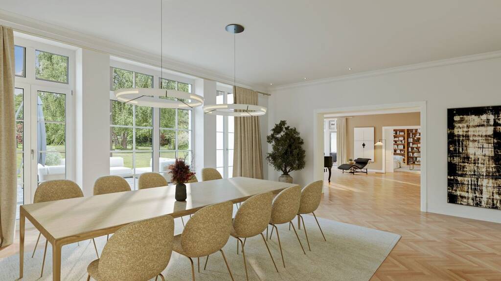 Bei den beiden Esszimmer-Bildern, Bibliothek/Kaminzimmer, Wohnküche, Schlafzimmer I und Zimmer II/Arbeitszimmer handelt es sich um virtuelles Staging.