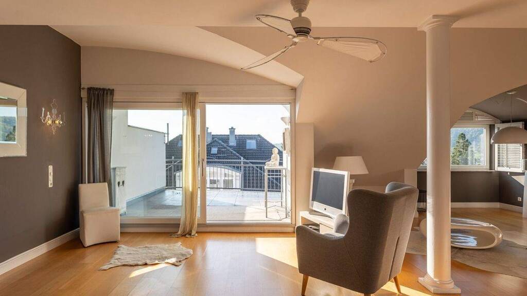 Diese wunderschöne, lichtdurchflutete 2-Zimmer-Penthouse-Wohnung vereint exklusives Wohnen mit einem unvergleichlichen Blick in die Ferne. Sie liegt in einem von zwei zusammengehörenden, gepflegten Mehrfamilienhäusern mit insgesamt 17 Wohnungen. Das Baujahr 2006 steht für eine moderne und solide Massivbauweise. Der Eigentümer legte sehr großen Wert auf Qualität und Langlebigkeit der Innenausstattung. Werte, die Sie hier jeden Tag spüren werden. Besonders beeindruckend ist die großzügige Dachterrasse nach Süden, die mit ihrem traumhaften Weitblick ein Ort der Ruhe und Erholung ist. Stellen Sie sich vor, wie Sie hier entspannte Stunden verbringen, den Sonnenuntergang genießen oder laue Sommerabende mit Freunden feiern. Ein weiterer Balkon nach Westen bietet zusätzlichen Freiraum im Freien und lädt zum Verweilen ein. Im Inneren der Wohnung fallen sofort die großzügigen Raumhöhen und die großen Gauben ins Auge, die das Licht sanft einfangen und ein luftiges, offenes Wohngefühl schaffen. Echtholz-Parkettboden, eine Fußbodenheizung sowie dimmbare Lichtschalter und Einbaustrahler unterstreichen die hochwertige Ausstattung. Die moderne Einbauküche ist perfekt für kulinarische Abenteuer und geselliges Kochen. Das Tageslichtbad ist ein echtes Highlight. Hell gefliest und mit Badewanne sowie separater Dusche ausgestattet. Hier können Sie morgens kraftvoll in den Tag starten oder abends wunderbar entspannen. Ein praktischer Abstellraum mit Waschmaschinenanschluss sorgt für zusätzlichen Komfort. Für ausreichend Stauraum stehen Ihnen zudem zwei Kellerräume zur Verfügung. Bequem erreichen Sie Ihre Wohnung mit dem Aufzug und Ihr Fahrzeug parkt sicher auf dem ebenen Tiefgaragenstellplatz. Diese Wohnung bietet nicht nur ein Zuhause, sondern ein Lebensgefühl exklusiv, hell und voller Möglichkeiten. Die Lage, die Ausstattung und der einmalige Blick machen dieses Penthouse zu einem echten Juwel.