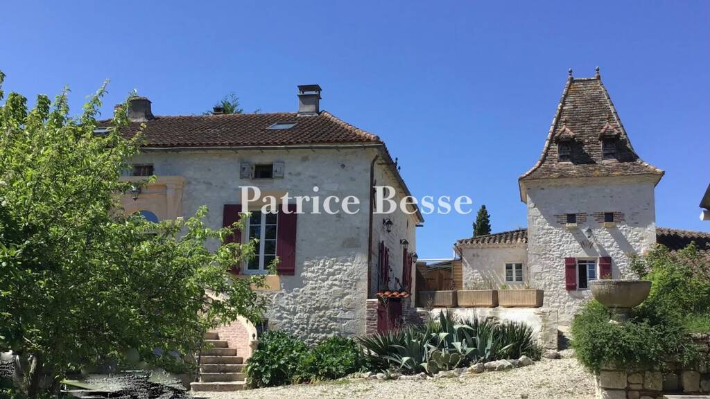 A renovated limestone dwelling from the 19th century, its guesthouse and barn on 4.5-hectare grounds, perched up on a hill near Tournon-d'Agenais.