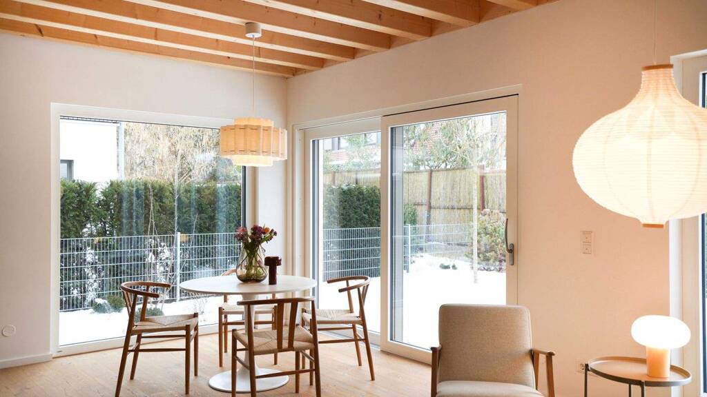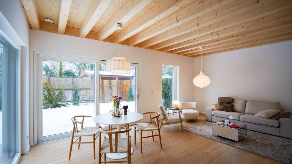 Im Erdgeschoss befindet sich ein großzügiger, offener Wohn- und Essbereich mit Zugang zum Garten. Bodentiefe Holz-Alu-Fenster mit Raffstores sorgen für helle Räume und fließende Übergänge zwischen innen und außen. Ergänzt wird das Geschoss durch ein Arbeitszimmer, ein Gäste-WC und eine praktische Speisekammer. Der Garten verfügt über eine automatische Bewässerung sowie ein im Stil des Hauses ausgeführtes Gartenhaus mit zusätzlichem Stauraum.