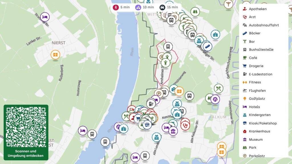Für die Versorgung im Alltag ist ebenso gesorgt. Ein Supermarkt wie Netto Marken Discount befindet sich in ca. 0,9 km Entfernung. Darüber hinaus liegen mit der Bäckerei Bolten und der Bäckerei Wittlaer zwei Anlaufstellen für den schnellen Einkauf in ca. 0,9 km. Auch für das Laden eines E Autos stehen E Ladestationen in der näheren Umgebung zur Verfügung, jeweils in ca. 0,8 bis 0,9 km.
