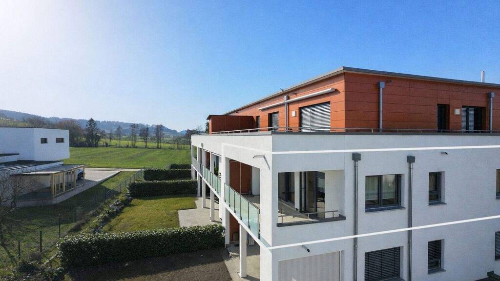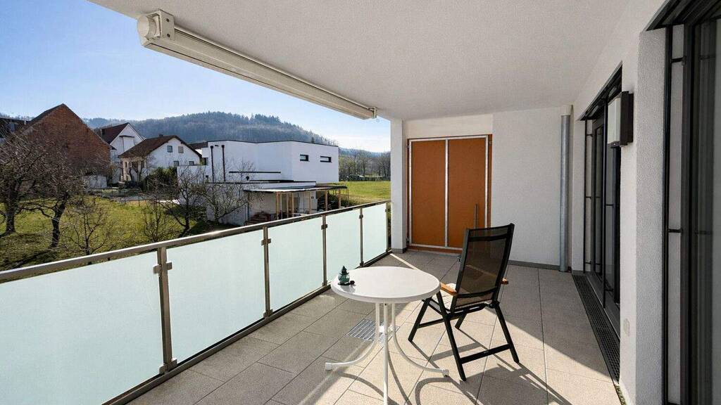 Herzstück der Wohnung ist der lichtdurchflutete Wohn- und Essbereich mit offener Küche, der eine moderne und einladende Wohnatmosphäre schafft. Von hier aus gelangen Sie direkt auf den großzügigen, überdachten Balkon, der mit einer wunderbaren Aussicht ins Grüne begeistert und zu entspannten Stunden im Freien einlädt.
