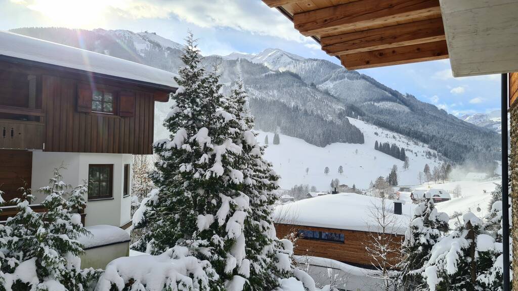 Der weitläufige Balkon bietet ausreichend Platz für Terrassenmöbel und gewährt Ausblicke auf die Skiabfahrt am Bernkogel sowie die beeindruckende Berglandschaft von Saalbach.