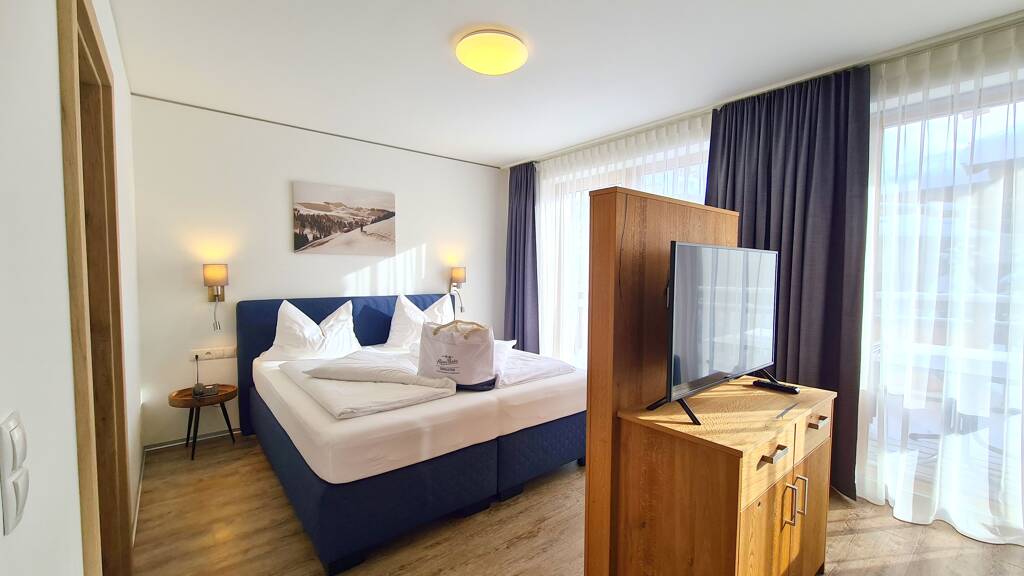Der offene und lichtdurchflutete Wohn- und Schlafbereich ist in alpinen Chic hochwertig möbliert, während das moderne, großzügige Badezimmer mit einer entspannenden Regendusche punktet.