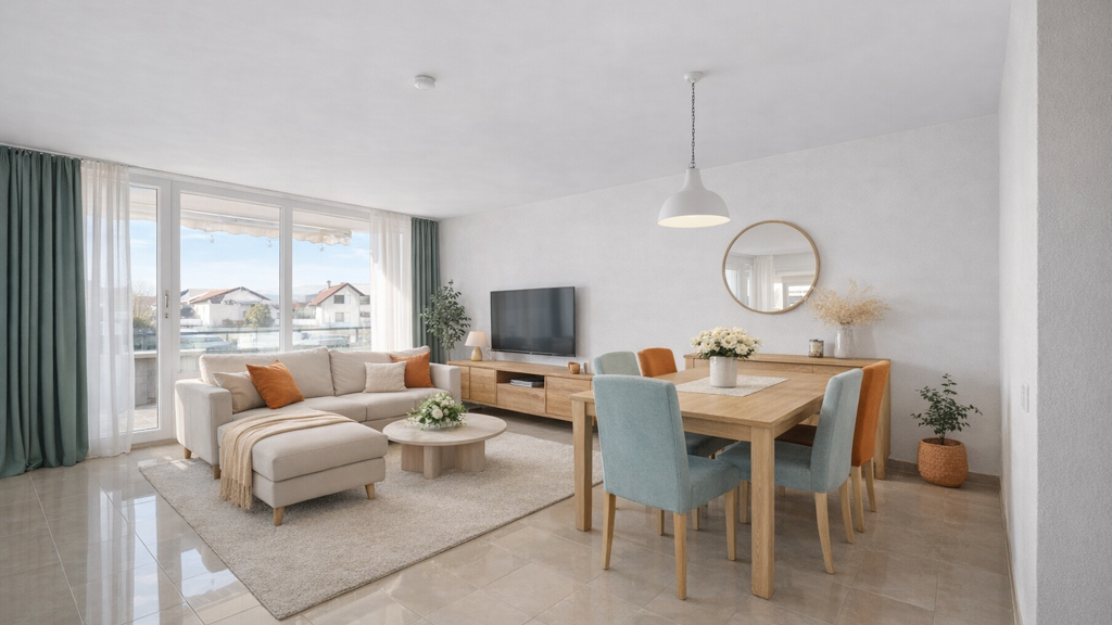 Bereits beim Öffnen der Eingangstüre empfängt Sie ein klar strukturierter, einladender Eingangsbereich, der ein Gefühl von Ordnung und Großzügigkeit vermittelt. Rechter Hand öffnet sich der Wohnbereich - lichtdurchflutet, offen gestaltet und der natürliche Mittelpunkt der Wohnung. Hier verschmelzen Wohnen und Essen zu einem harmonischen Raumensemble, das sowohl zum Entspannen als auch zum geselligen Beisammensein einlädt. Eine dekorativ, mauerartig verkleidete Wand setzt einen stilvollen Akzent und verleiht dem Raum Charakter und Tiefe.