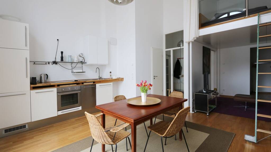 Modern and bright apartment situated on Tivoliplatz in a beautiful historical landmark building with private access to Viktoria park. High ceilings and an efficient floor plan gives the apartment a very lofty and spacious feeling. Wooden parquet, handpicked interior pieces and furniture from various decades are well decorated all the way through. The open plan kitchen is fully equipped and is connected to the living area and includes a dining table that can seat up to four persons. The smaller and second lounge area feels very private and invites for chilling or simply enjoying home entertainment on the flatscreen TV. This room can be also used as a second bedroom on request. Upstairs you`ll find the main bedroom with a king size loft bed including great views onto the lower level. The modern bathroom has a walk in rain shower and a washing machine.