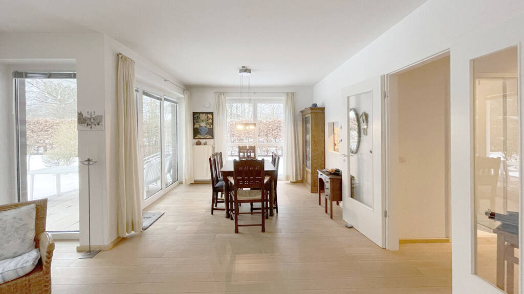 Die zeitgemäße Vier-Zimmer-Wohnung befindet sich im Erdgeschoss und ist über das Treppenhaus mit wenigen Stufen vor der Hauseingangstür zu erreichen. Vom zentralen, mit Parkett versehenen Flurbereich gelangen Sie in das großzügige und helle Wohnzimmer, welches ebenfalls über Parkettboden verfügt. Vom Wohnbereich aus gelangen Sie auf die schöne, nach Südwesten ausgerichtete Terrasse und in den privaten Garten. Drei weitere Räume stehen zur Verfügung, von denen ein Raum ebenfalls über Parkettboden verfügt. Die anderen Räume sind mit Teppichboden ausgestattet. Zwei Bäder, bei einem müsste eine neue Duschwanne installiert werden, sowie die Küche mit Durchreiche zum Wohnbereich runden gemeinsam mit einem kleinen Abstellraum das Raumangebot ab. Einen Stellplatz für die Waschmaschine und einen Trockner finden Sie in der Nische eines der Bäder. Eine kontrollierte Be- und Entlüftungsanlage sorgt für ein angenehmes Raumklima.