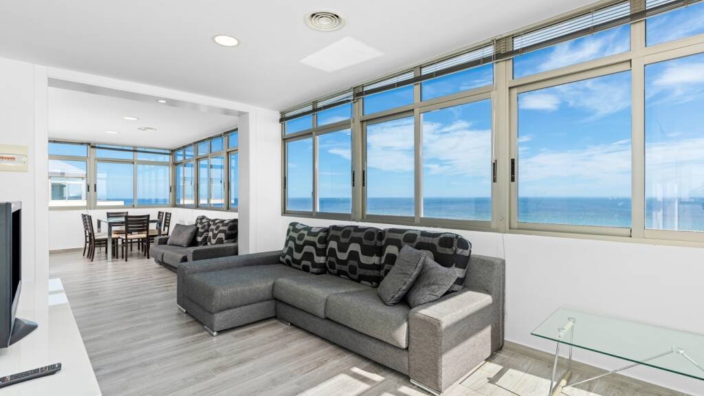Das Penthouse verfügt über ein Schlafzimmer, zwei Badezimmer, eine Küche und einen Raum mit großen Fenstern mit Blick auf das Meer, der als Esszimmer und Wohnzimmer dient. Die Wohnung verfügt über eine Klimaanlage.