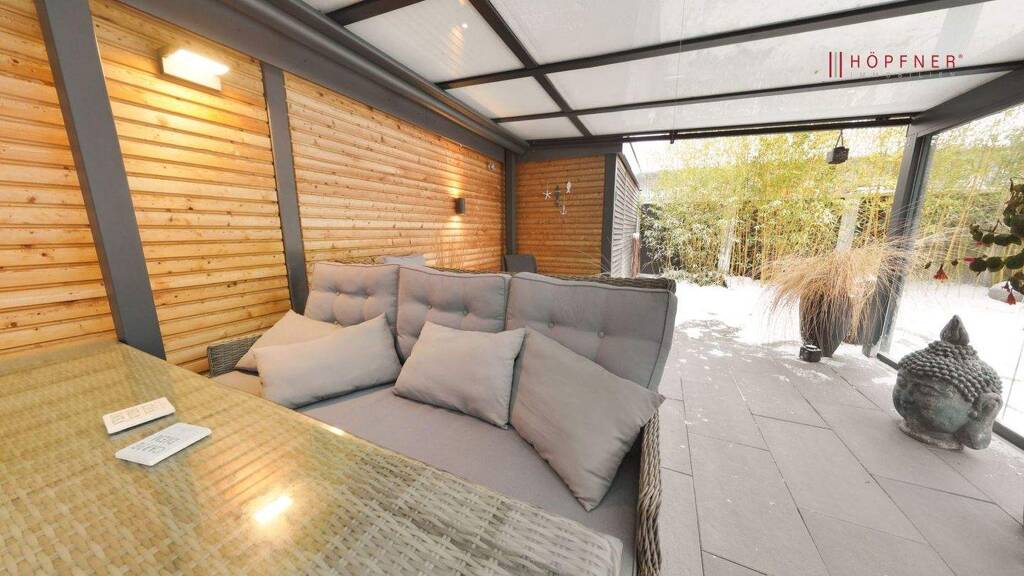 Auf einem ca. 880 m² großen Grundstück verteilen sich ca. 242 m² Wohn- und Nutzfläche über zwei Etagen (Vollgeschosse). Die derzeitige Gewerbeeinheit im Erdgeschoss bietet ca. 125 m² Nutzfläche, verteilt auf einen Ausstellung- /Büroraum, ein Duschbad, ein Gäste-WC und eine Küche mit Sitzgelegenheit als Aufenthaltsraum. Zusätzlich stehen im Erdgeschoss ein Abstellraum, ein weiterer Büro- oder Multifunktionsraum zur Verfügung. Die gemütliche Terrasse wurde mit einem modernen Glasdach in gehobener Qualität überbaut.