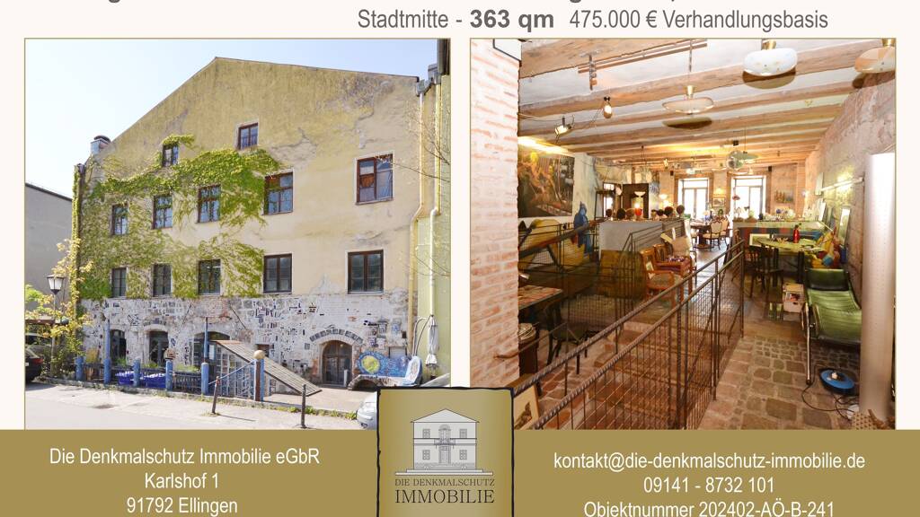 Sanierung ab dem 1. OG erforderlich; das Dach muss grundsaniert werden. Der historische Saal mit Empore im 1. OG muss erhalten bleiben.