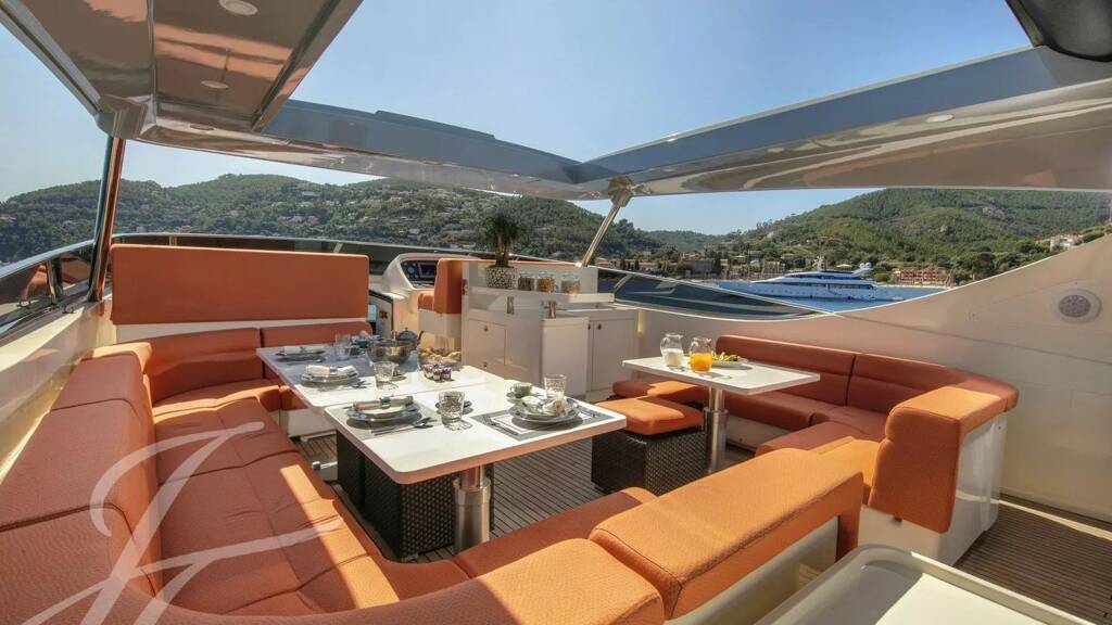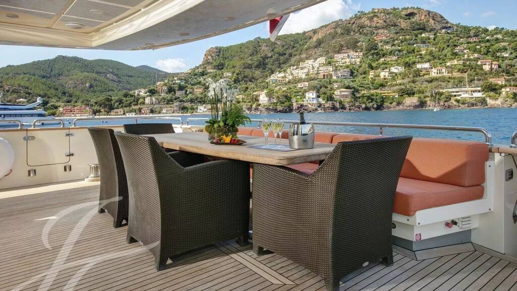 Alternativement, son pont avant spacieux est équipé de trois grandes chaises longues pour ceux qui préfèrent se détendre en profitant du soleil et du ciel bleu. Le pont arrière du Y42 comprend une table arrière pour dîner en plein air le soir et peut accueillir confortablement 10 personnes.