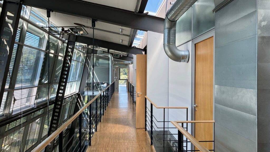 Das moderne Bürogebäude überzeugt durch seine prägnante Glasfassade und klare, zeitgemäße Architektur. Großzügige Fensterflächen schaffen helle, offene Arbeitsbereiche und verleihen dem Gebäude einen transparenten und professionellen Charakter.