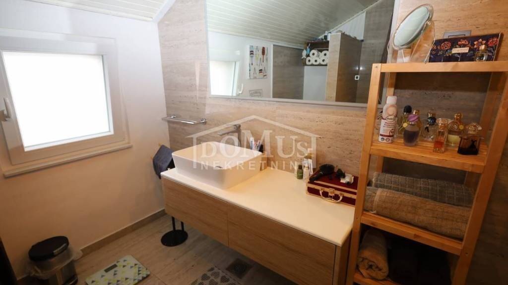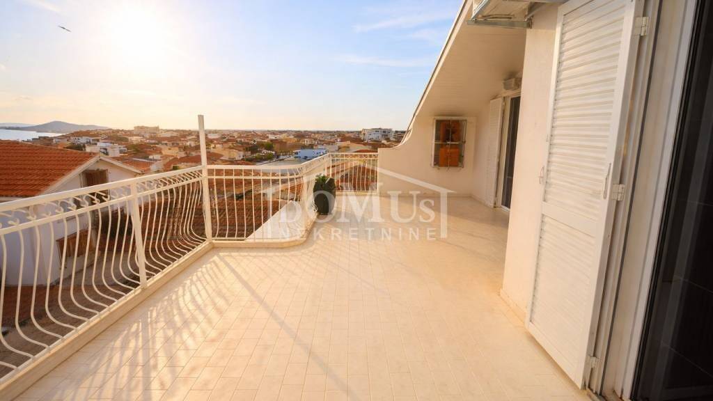 Vodice - in attraktiver und ruhiger Lage steht eine großzügige Dreizimmerwohnung mit einer Gesamtfläche von 116,84 m² zum Verkauf, gelegen im zweiten Stock eines kleineren Wohngebäudes. Die Wohnung verfügt über einen privaten Eingang, der über eine Innentreppe erreichbar ist, welche ausschließlich zu dieser Einheit gehört und zusätzliche Privatsphäre gewährleistet. Sie besteht aus einem Flur, einem geräumigen Wohnbereich mit Küche und Esszimmer mit Zugang zu einer nicht überdachten Terrasse von 29,40 m² mit Meerblick, drei Schlafzimmern sowie einem Badezimmer. Zur Wohnung gehört außerdem ein 79 m² großer, charmant gestalteter Privatgarten mit Wasser- und Stromanschluss sowie einem zusätzlichen WC, sowie ein Außenstellplatz. Die Wohnung ist mit Klimaanlagen zum Heizen und Kühlen sowie PVC-Fenstern. Die Möblierung ist im Kaufpreis inbegriffen. Der gepflegte Strand ist 800 m entfernt, das Stadtzentrum und alle wichtigen Einrichtungen befinden sich nur 600 m entfernt.