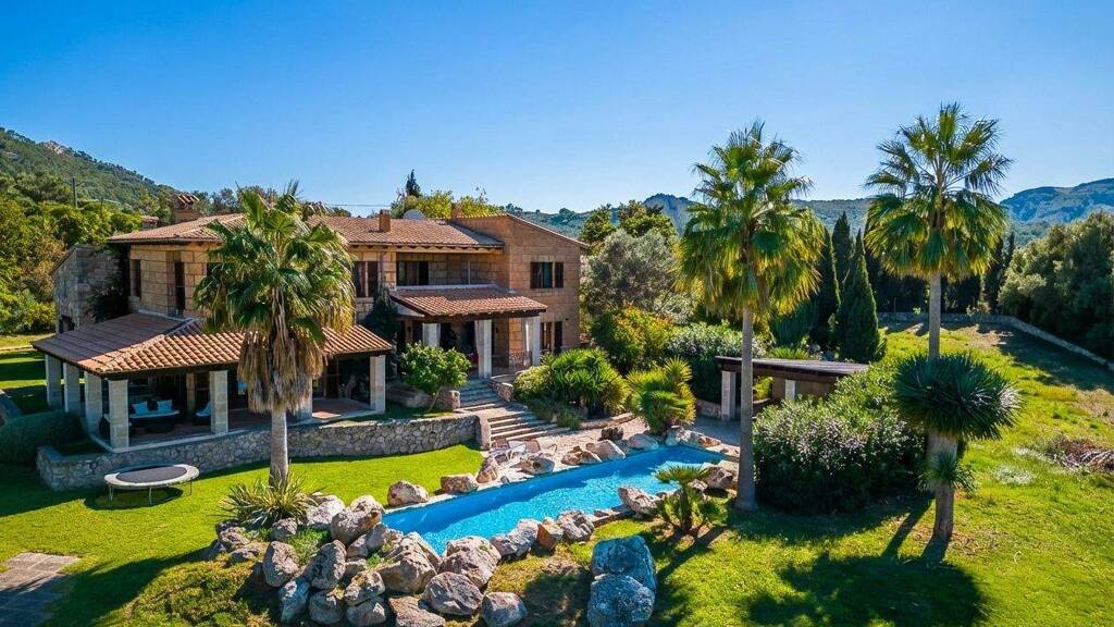 Die Steineinfahrt führt zum zweigeschossigen Haupthaus mit einer Wohnfläche von unglaublichen 450 qm. Im Erdgeschoss gibt es eine geräumige Einbauküche mit Essbereich und Zugang zur Südterrasse, einen großen Wohnsalon mit Kamin und bodentiefen Fenstern für einen herrlichen Blick auf das Alcudia-Tal bis zur Bucht von Pollensa. Ein Gäste-WC und ein eigenständiges Gästeappartement mit 2 Doppelschlafzimmern, einem Badezimmer, einer Kitchenette und einem Wohnbereich sind ebenfalls vorhanden. In der Mitte dieser Wohnebene befindet sich der charmante Patio mit einem eingewachsenen Wildoliven-Baum.