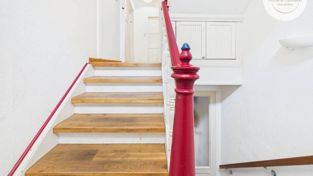 Ein besonderes Highlight bildet das Treppenhaus mit einem großen dreifach verglasten Fenster, das 2013 eingebaut wurde und für außergewöhnlich viel Tageslicht sorgt. Hochwertige Holzdielen im Wohn-, Ess- und Küchenbereich aus dem Jahr 2012 sowie weitere Holzdielen im Treppenbereich aus dem Jahr 2014 unterstreichen den authentischen Altbaucharakter der Immobilie.