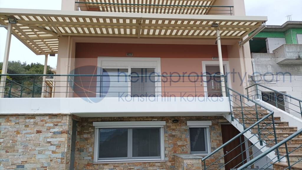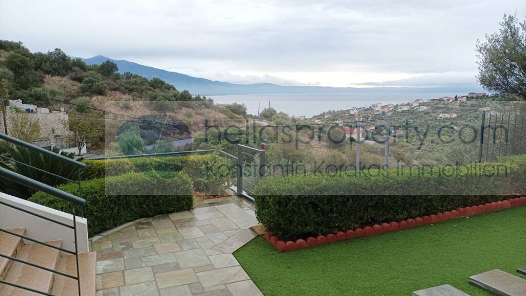 In der begrünten Ortschaft Alykes nahe Volos thront dieses wunderschöne Zweifamilienhaus über dem Meer und dem Dorf.
