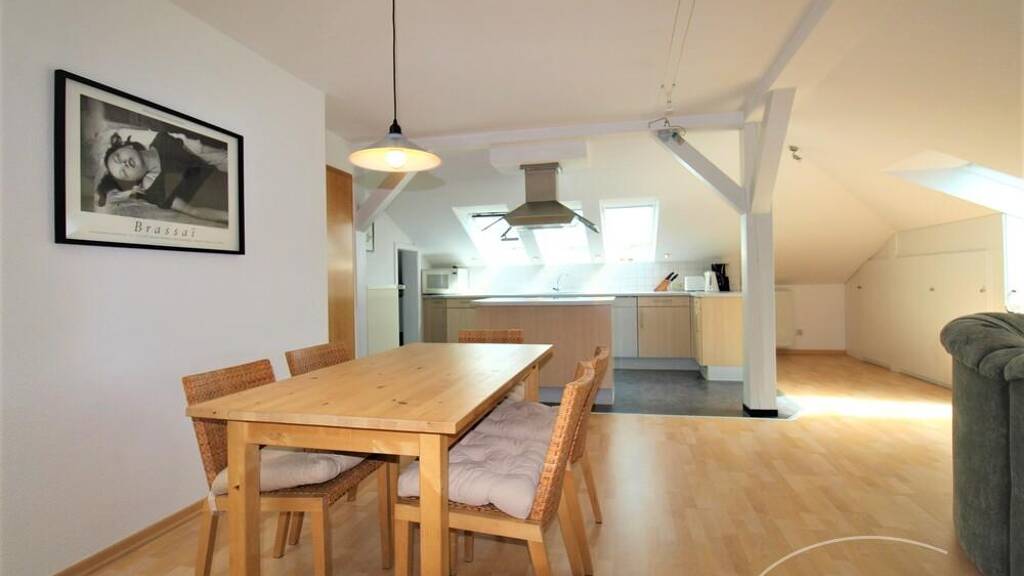 + Die Wohnung befindet sich in einer umfassend sanierten Villa, die unter Denkmalschutz steht. Sie bietet Platz für max. 3 Personen. + Eine offene amerikanische Küche enthält alles was man benötigt, z.B. Geschirrspüler, Mikrowelle, Backofen, Induktiv-Kochfeld, Kühlschrank, beleuchteter Edelstahl-Dunstabzug u.v.m. + Das Bad ist ausgestattet mit Dusche, WC, Bidet, Badewanne und Waschbecken. + Die Waschmaschine mit integriertem Trockner befindet sich im Wasch- u. Trockenkeller. + Die Wäsche kann auch im Garten getrocknet werden. + Für die sonnige Dachterrasse sind Stühle, Tisch und Liege vorhanden. + Ein Klimagerät (Split-Gerät) sorgt im Sommer für angenehme Raumtemperaturen. + Eine kleine Gefriertruhe steht im Abstellraum der Wohnung. In den Einbauschränken im Schlafzimmer und im Wohnbereich ist genügend Platz. + Zusätzlich können in den Abseiten und im Abstellraum eigene Sachen gelagert werden.