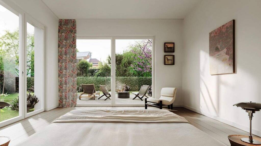 Über die riesigen Fenstertüren gelangt man aus fast allen Räumen in den Privatgarten dieser perfekten Wohnung.