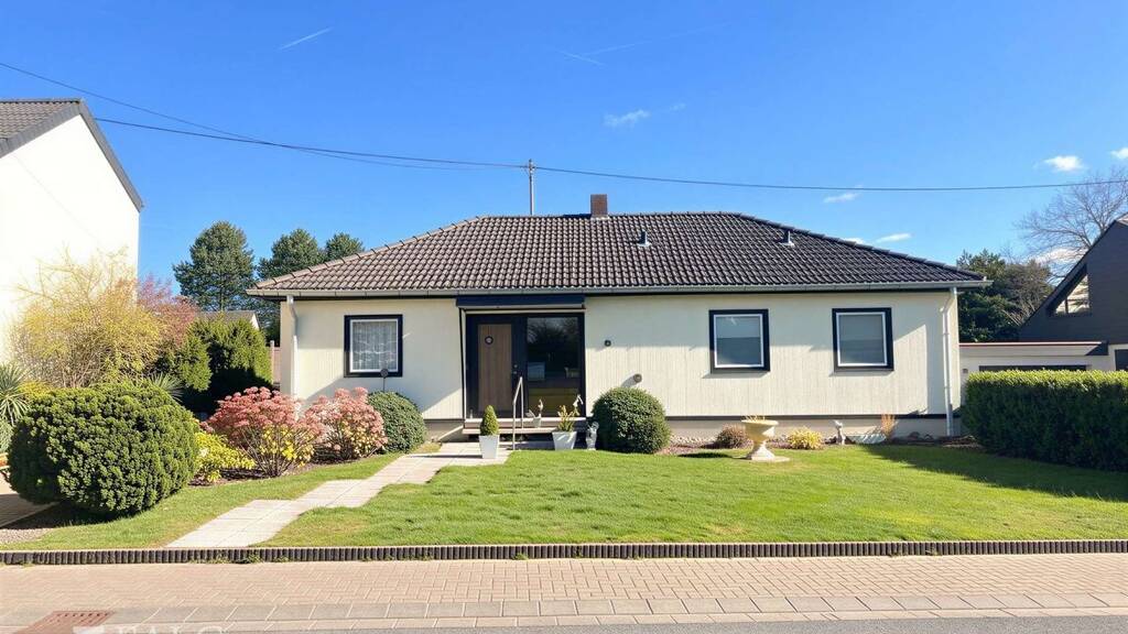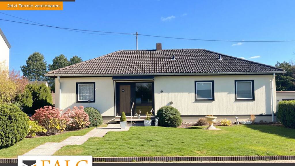 Zum Verkauf steht ein gepflegter, freistehender Bungalow in solider Fertigbauweise mit durchdachter Raumaufteilung und hellen Wohnbereichen.